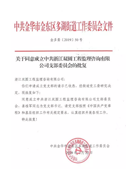 為積極響應和落實黨和國家對基層黨建工作的高度重視,充分發(fā)揮黨組織政治引領作用,助推基層黨建工作全面發(fā)展和企業(yè)穩(wěn)健發(fā)展。2019年5月22日,經(jīng)中共金華市金東區(qū)多湖街道工作委員會批準,中共浙江雙圓工程監(jiān)理咨詢有限公司支部委員會正式成立。現(xiàn)有正式黨員4名,經(jīng)支委會選舉,姜桂軍同志任第一屆支部委員會黨支部書記。