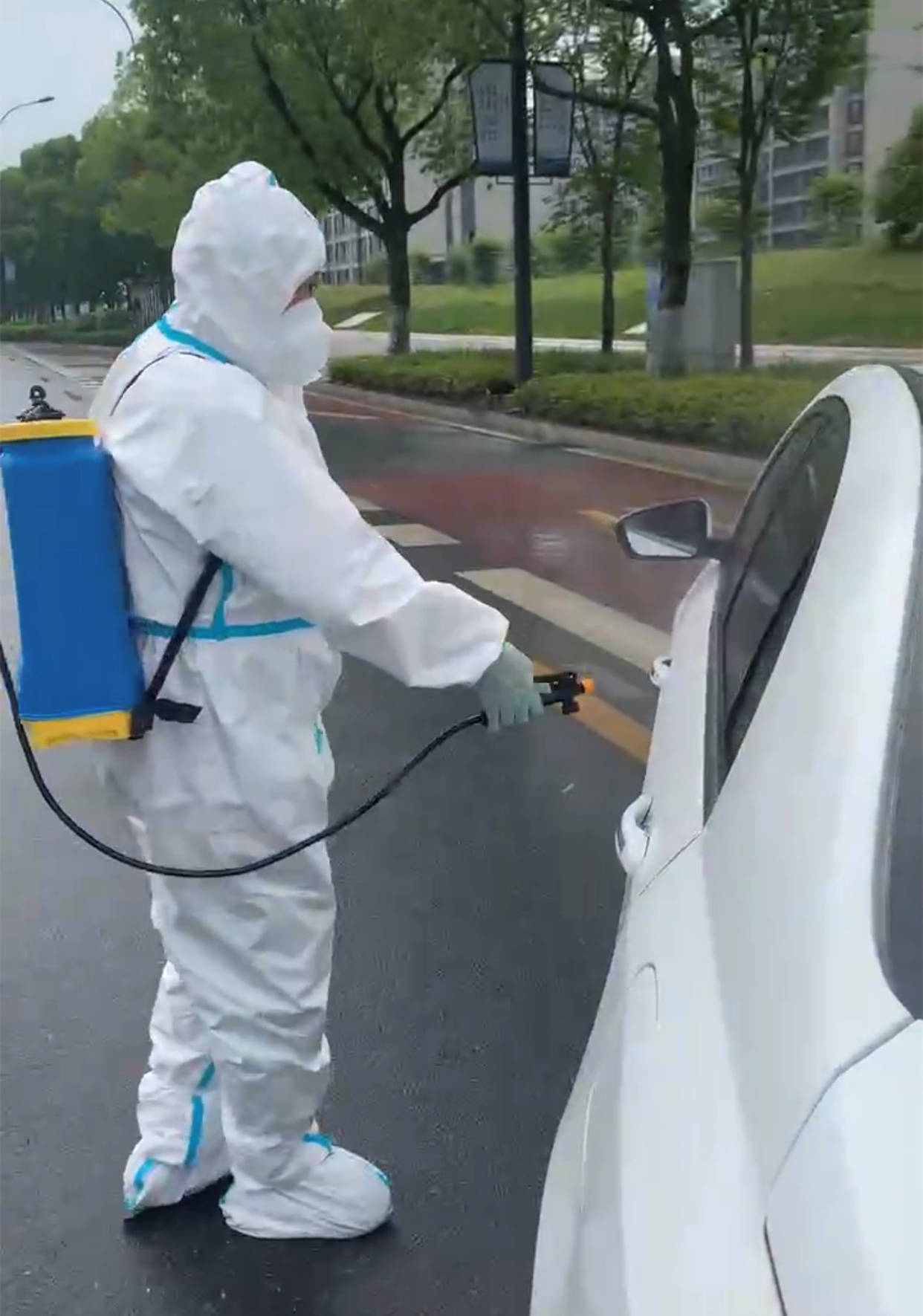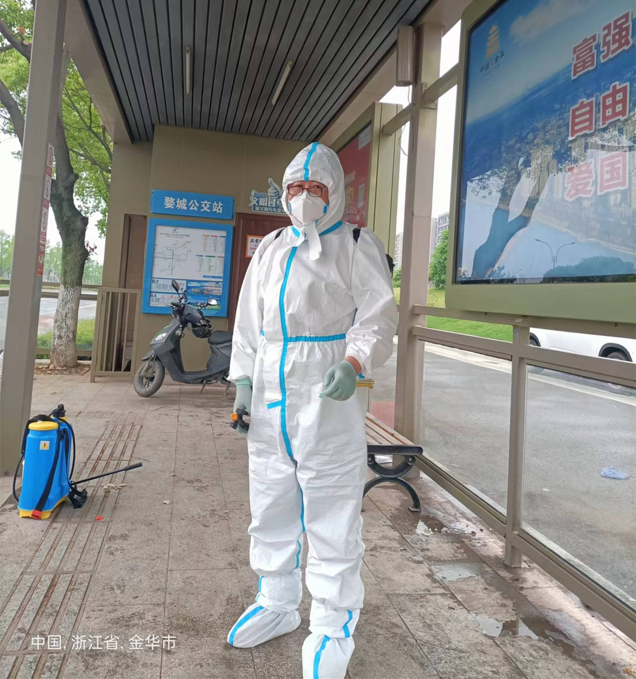 穿著防護(hù)服、背著噴霧器……婺城新區(qū)大馬路上多了一個(gè)裝備獨(dú)特的“消毒員”——吳慶平,他是浙江雙圓建設(shè)管理有限公司志愿者隊(duì)伍中的一員。