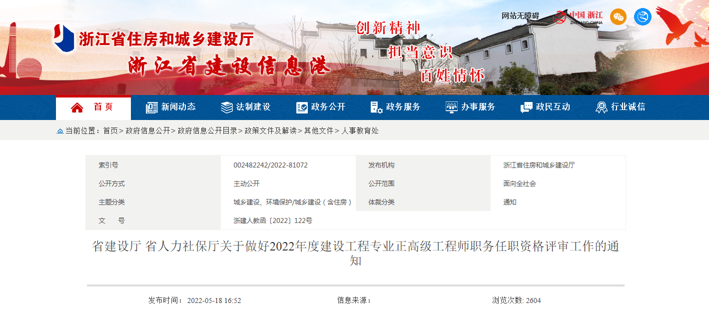 根據《浙江省人力資源和社會保障廳關于做好2022年度高級職稱評審工作的通知》(浙人社函〔2022〕31號)精神,現將2022年度建設工程專業正高級工程師職務任職資格評審工作有關事項通知如下: