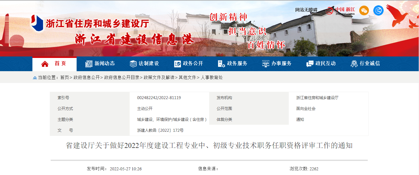 為做好2022年度建設工程專業中、初級專業技術職務任職資格評審工作,根據《浙江省職稱評審管理實施辦法》(試行)(浙人社發〔2020〕47號)精神,現將有關事項通知如下: