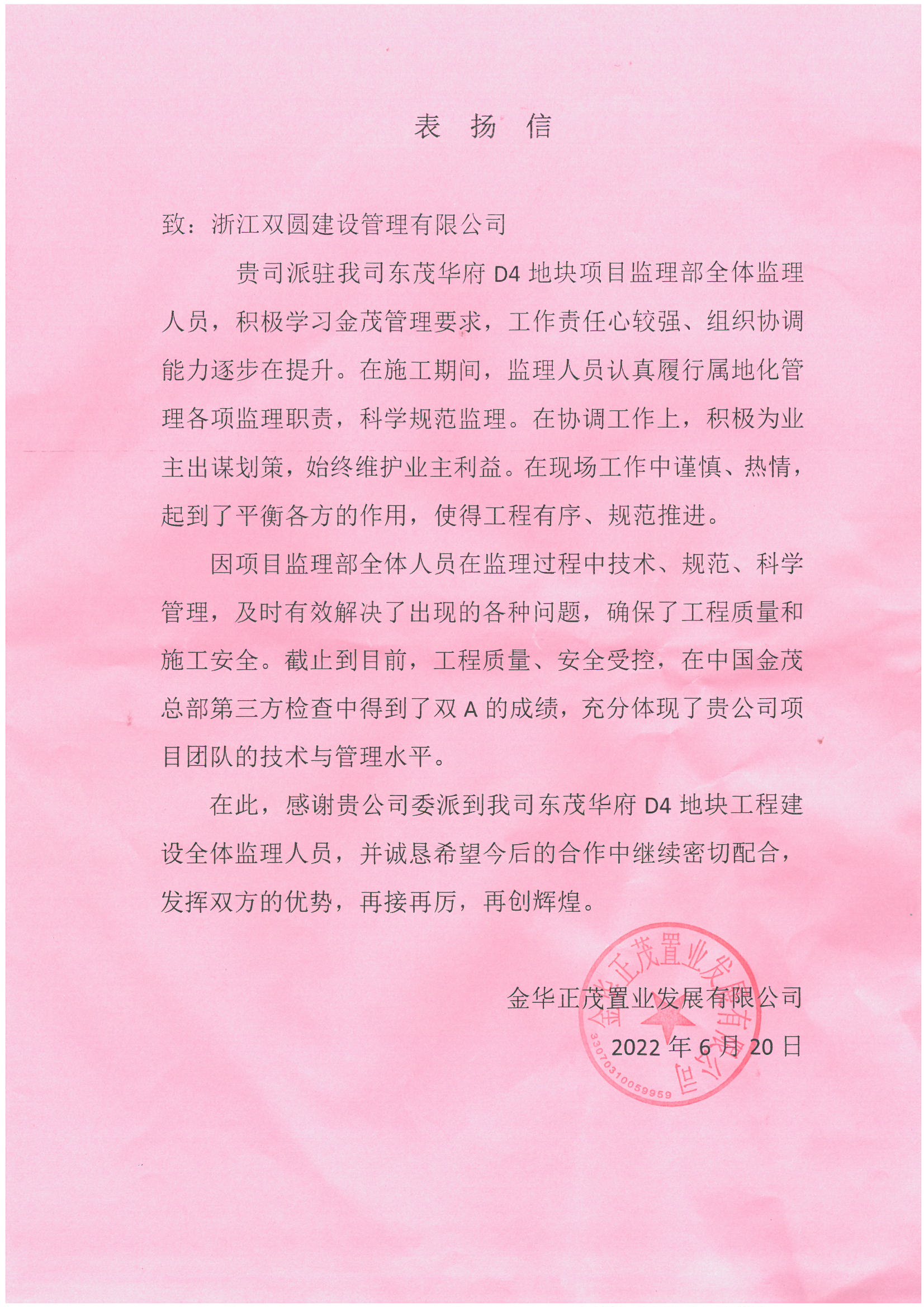 昨日下午,金華東湄未來社區2022年半年度階段性表彰大會上,業主就東湄未來社區D4地塊項目監理部以科學管理、熱情服務和高度敬業的工作精神給予充分肯定,授予了“優秀監理團隊”獎牌以茲表揚和鼓勵;同時也對徐艷超、邵鐳、錢罕晟、邵振榮等四人進行個人表彰。