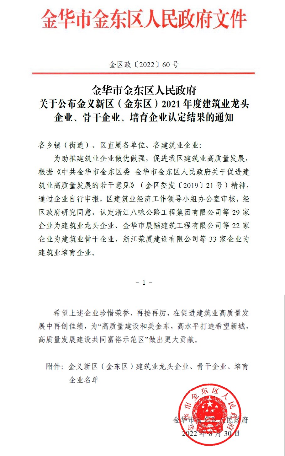 8月30日,金華市金東區(qū)人民政府發(fā)布了《金華市金東區(qū)人民政府關于公布金義新區(qū)(金東區(qū))2021年度建筑業(yè)龍頭企業(yè)、骨干企業(yè)、培育企業(yè)認定結果的通知》。我公司再次榮獲“金義新區(qū)(金東區(qū))建筑業(yè)龍頭企業(yè)”榮譽稱號,該榮譽是金義新區(qū)(金東區(qū))建筑業(yè)最高榮譽,也是我公司連續(xù)四年獲此殊榮。