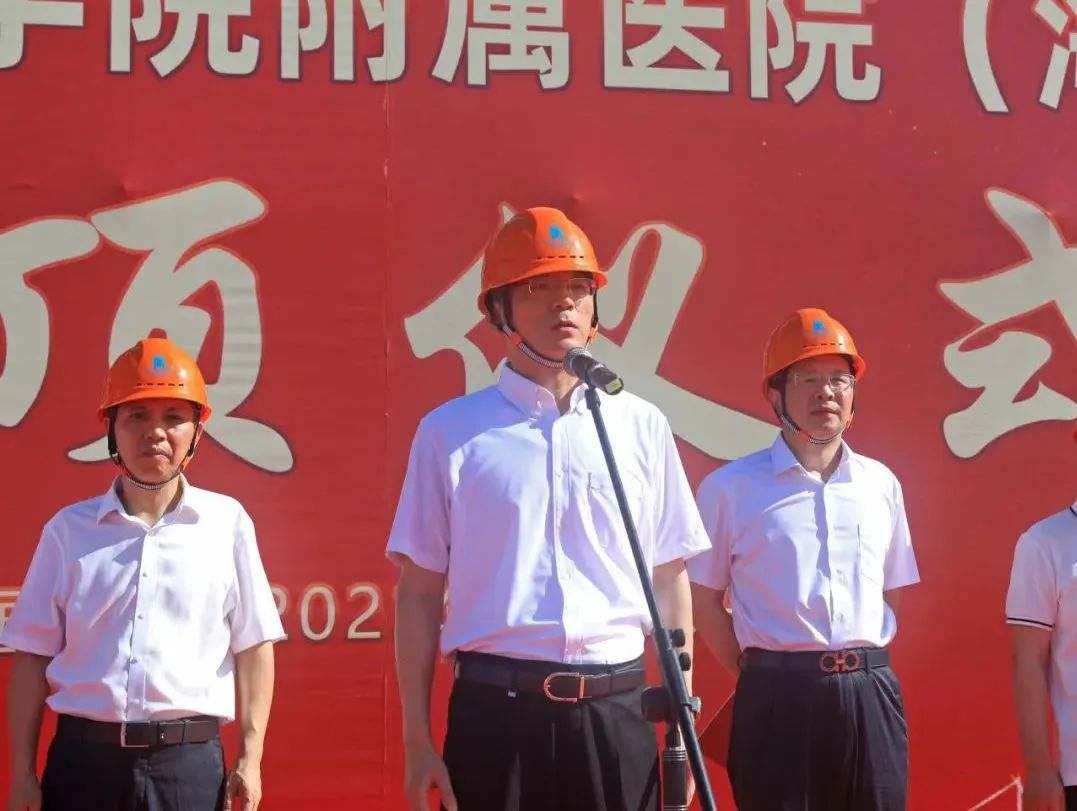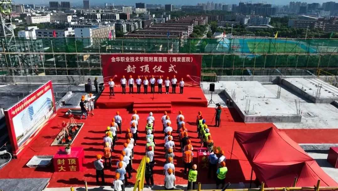 6月28日上午8點08分,金華職業(yè)技術(shù)學(xué)院附屬醫(yī)院(海棠醫(yī)院)項目在工地主樓樓頂舉行項目封頂儀式。