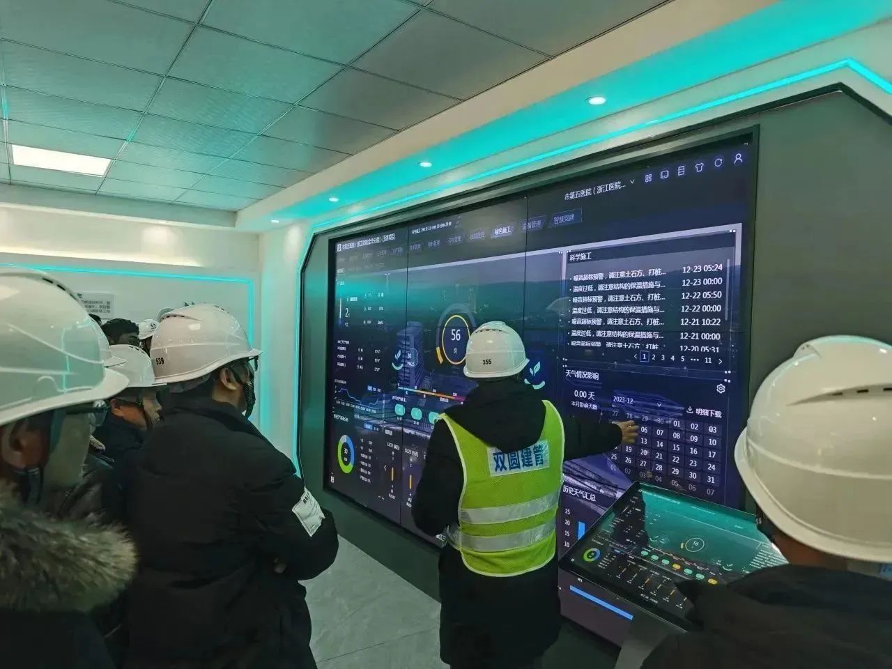 隨后,大家對智慧工地平臺進行了參觀。市第五醫院項目依托浙江三建的智慧工地平臺,在過程性管理、精細化管理的基礎上,實現了信息化、精細化、集約化,有效提升了工作效率。