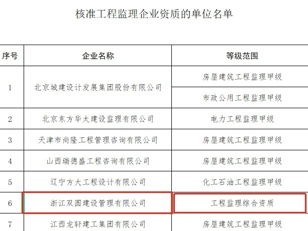 3月23日,住建部公布了《關于核準2023年度第三批建設工程企業資質名單的公告》,雙圓建管成功升級為工程監理綜合資質,這是公司發展史上一座新的里程碑,提升了公司的市場競爭力,為公司更好地發展多元化經營和打造全過程咨詢企業奠定了堅實基礎。雙圓建管也成為金華市區第一家具備工程監理綜合資質的咨詢單位。