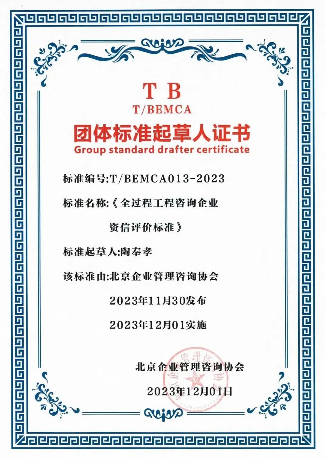 欲知平直,則必準繩;欲知方圓,則必規矩。建立全過程工程咨詢企業資信評價標準,是推進工程咨詢行業自律管理、優化行業服務的改革舉措,是以市場和用戶體現價值、以事后評價引領行業健康發展的重要手段。雙圓建管首次作為起草人參編了國家團體標準《全過程工程咨詢企業資信評價標準》,公司常務副總陶奉孝嚴格按照《標準》的制定流程,高質量、高標準完成了起草任務。該標準已于2023年12月1日起正式實施。