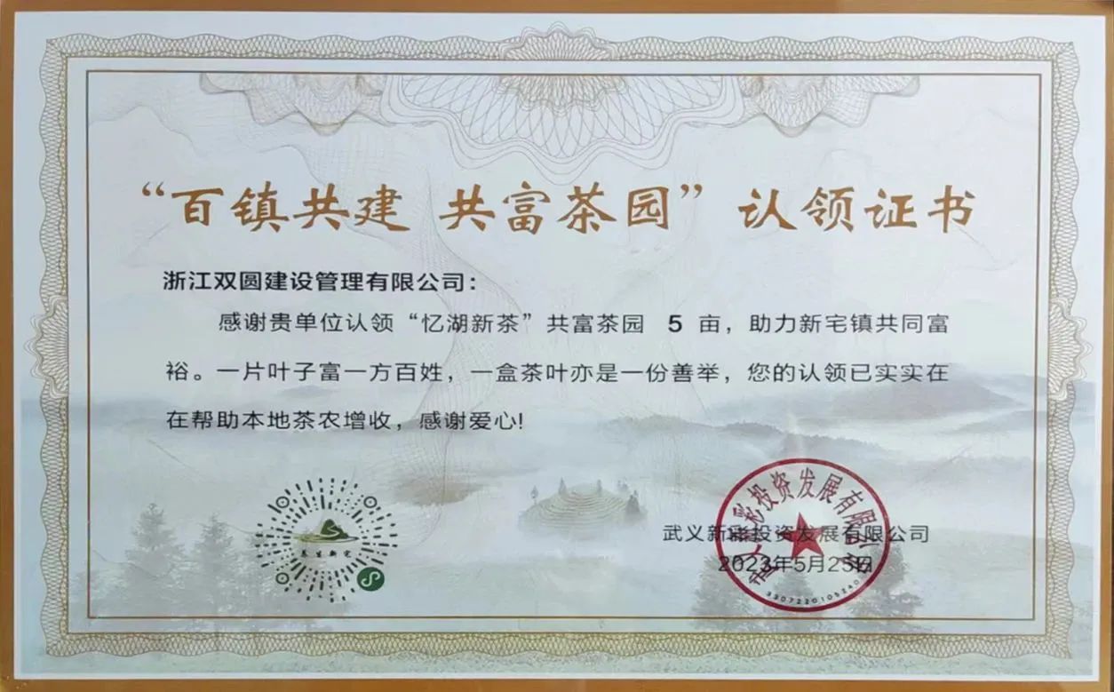 2023年5月,雙圓建管積極響應政府號召,以實際行動貫徹落實黨的二十大精神,雙圓建管勇于承擔企業社會責任,在“百鎮共建,共促發展”結對活動中認領“憶湖新茶”共富茶園5畝,為武義新宅鎮的共同富裕建設貢獻了力量,展現了雙圓建管應有的企業責任與擔當。