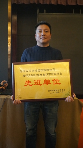 在會議表彰環節,雙圓建管榮獲“2023年度金華市市政行業先進單位”榮譽稱號,吳總作為公司代表上臺領獎。