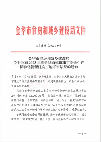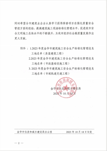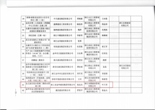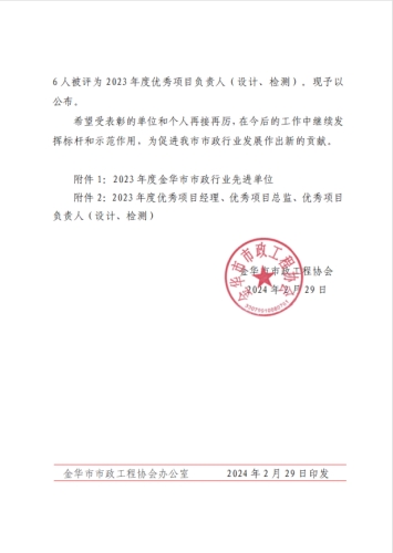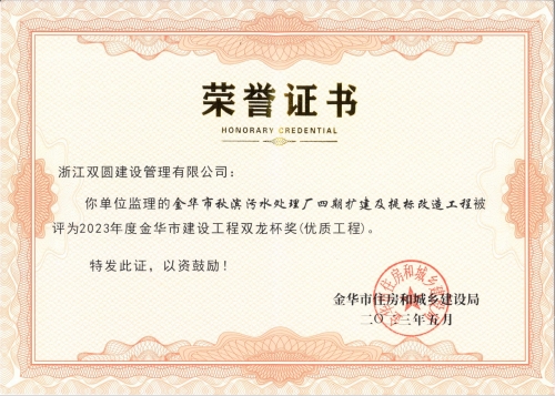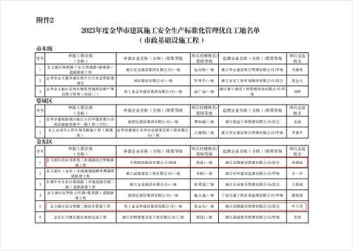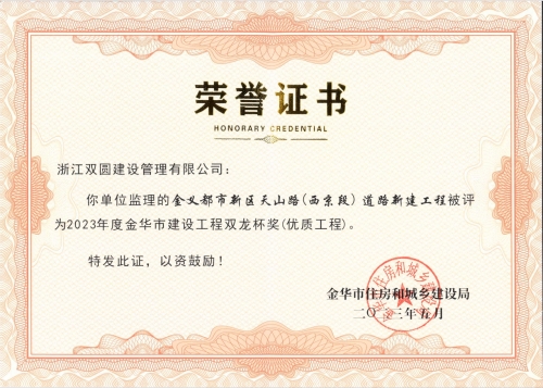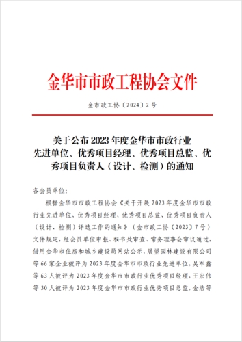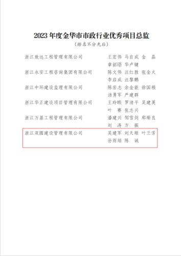2023年,雙圓建管在市政領域收獲累累碩果。吳建軍、孫雨培等5人獲“2023年度金華市市政行業優秀項目總監”榮譽稱號;金義新區綜合管廊二期給水管道工程等2個項目獲“2023年度浙江省建筑施工安全生產標準化管理優良工地”榮譽;金華市秋濱污水處理廠四期擴建及改造提升工程等2個項目獲“2023年度金華市建設工程雙龍杯(優質工程)”榮譽;金義新區沿法華街等三條道路綜合管廊新建工程等11個項目獲“2023年度金華市建筑施工安全生產標準化管理優良工地”榮譽。