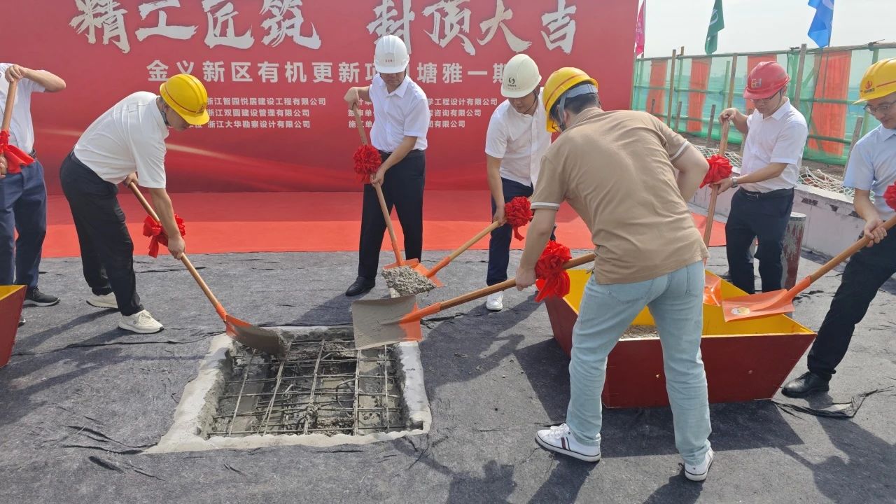隨著一聲“我宣布,金義新區有機更新塘雅一期順利封頂!”各位與會領導移步頂樓,所有人滿懷喜悅與激動,共揮金鍬,澆下最后一方混凝土,標志著項目正式迎來了喜結金頂的喜人時刻。