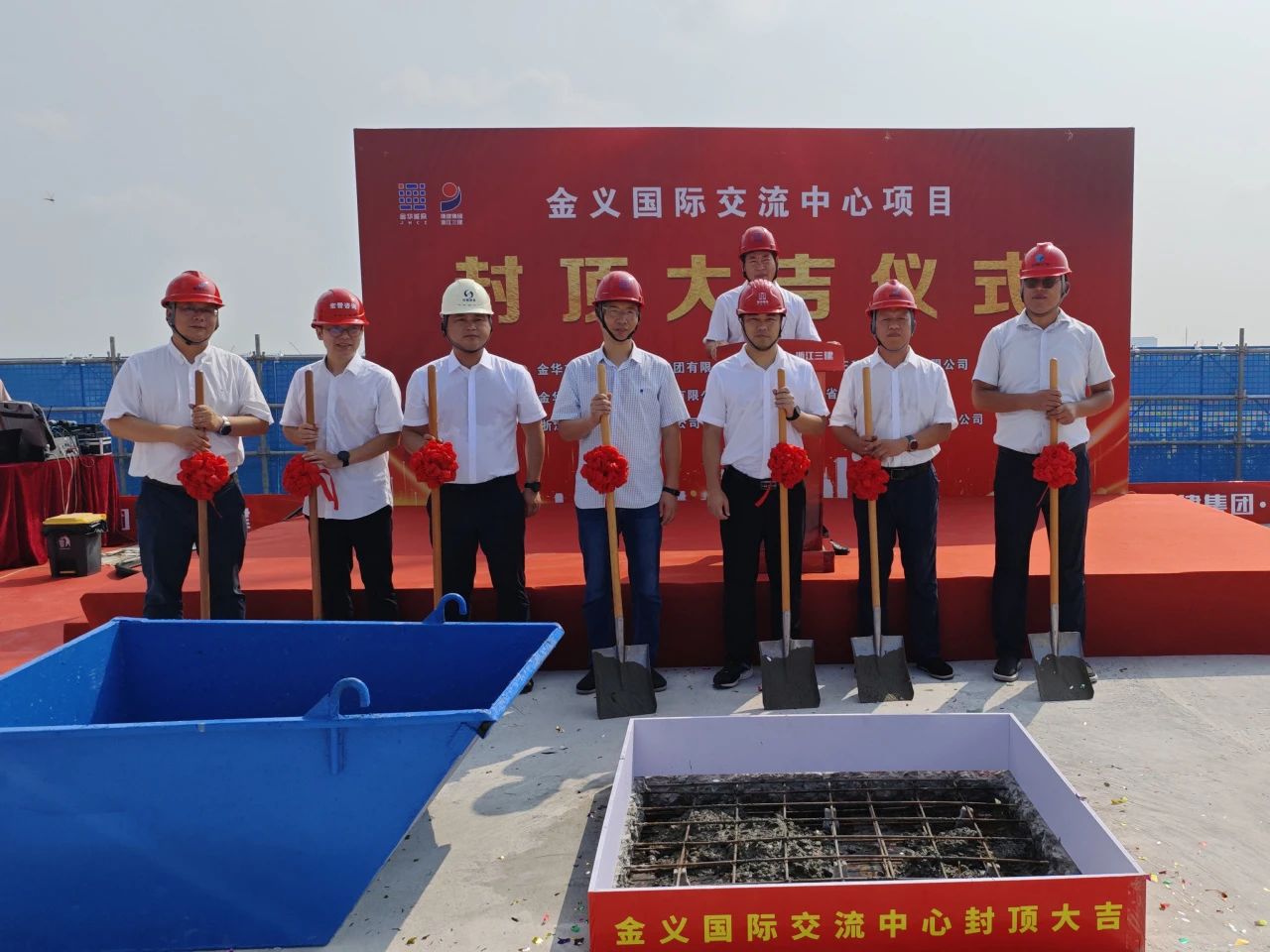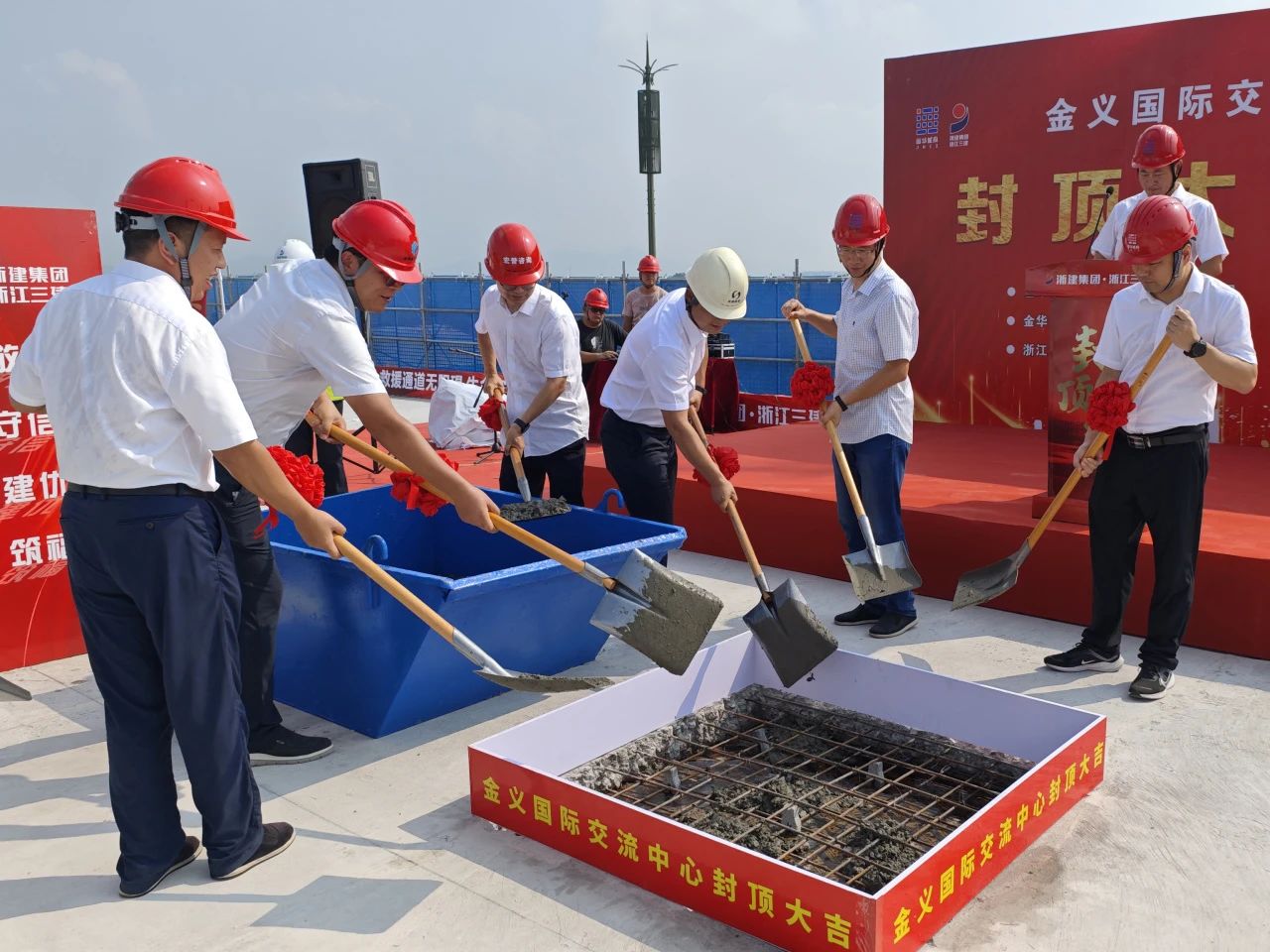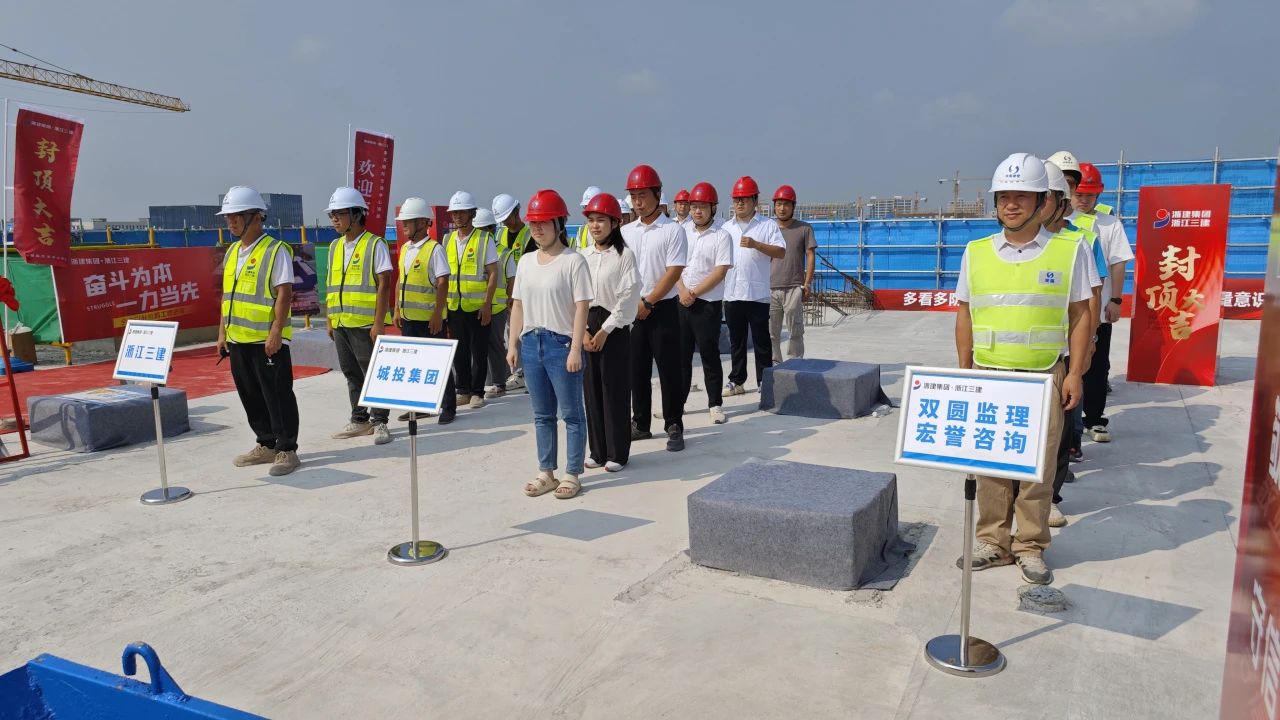 8月16日上午,伴隨著一陣禮花聲,由雙圓建管監(jiān)理的金義國際交流中心項目隆重舉行結(jié)頂儀式,建設(shè)單位代表、各參建單位負(fù)責(zé)人出席儀式,雙圓建管常務(wù)副總陶奉孝和項目監(jiān)理團(tuán)隊參加封頂儀式。