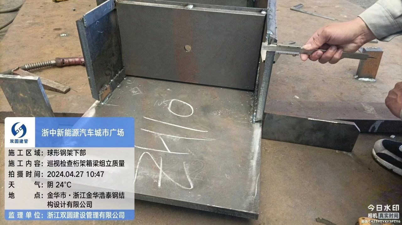 位于浙中新能源汽車城市廣場項目2號樓與3號樓之間的球型鋼架結構,是金華市目前體量最大的鋼構,以一個主軸聯合多根桁架架空,技術含量高,對監理工作的專業性要求高,且鮮有相關可借鑒的監理經驗。為更好地做好監理工作,公司總工辦、工程管理中心通過參與方案評審、專家論證會、企業帶班檢查、過程巡檢等方式積極給予技術支撐與指導。