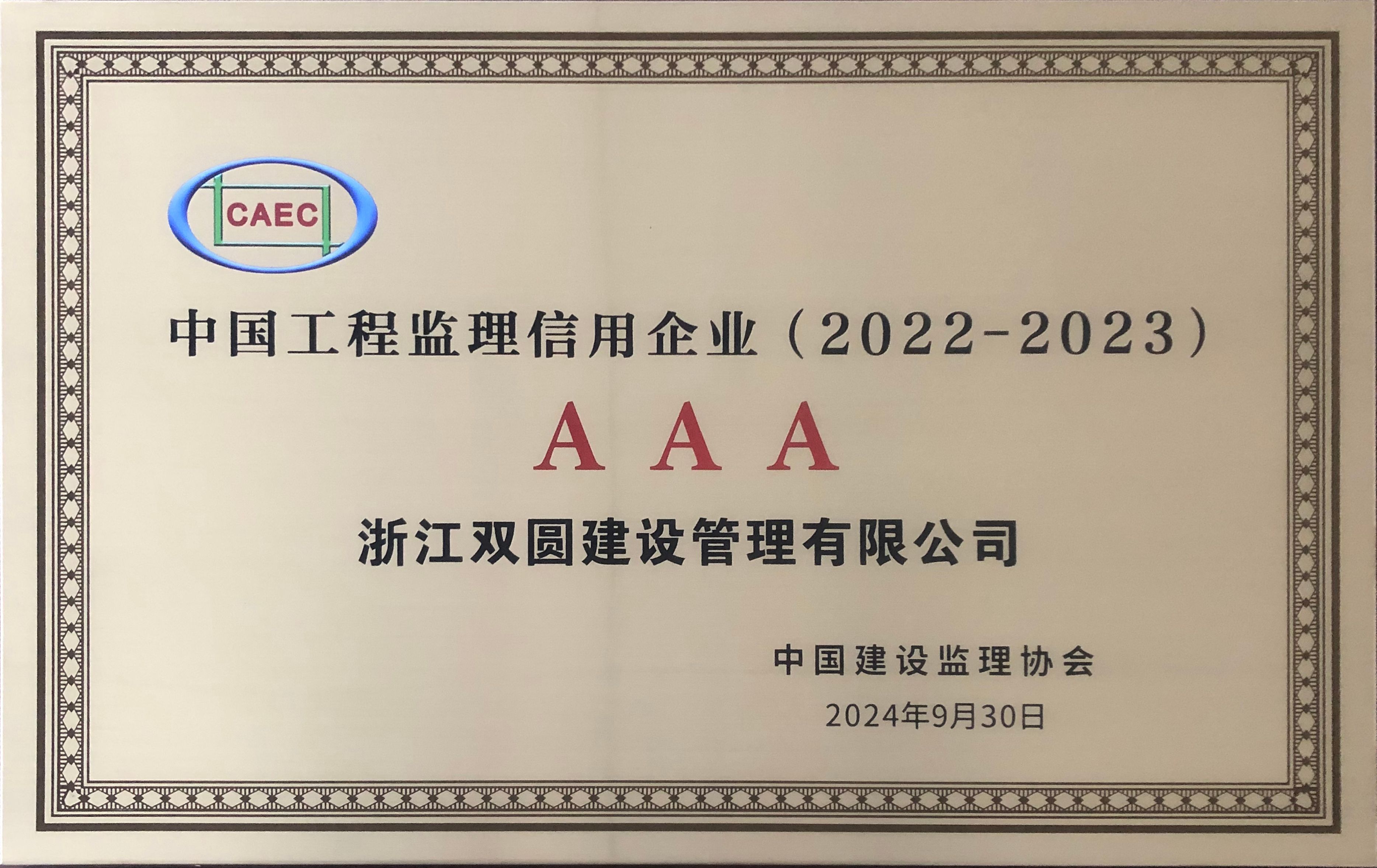9月,公司榮獲2022-2023年度中國工程監理AAA級信用企業證書。這是對雙圓建管在誠信經營、規范管理等方面的充分肯定。公司始終堅持以誠信為本,嚴格遵守行業規范和法律法規,憑借良好的信譽和優質的服務,贏得了客戶的信賴和市場的認可。該證書的獲得,進一步提升了公司的品牌形象和市場競爭力,為公司在未來的市場拓展中奠定了堅實的基礎。