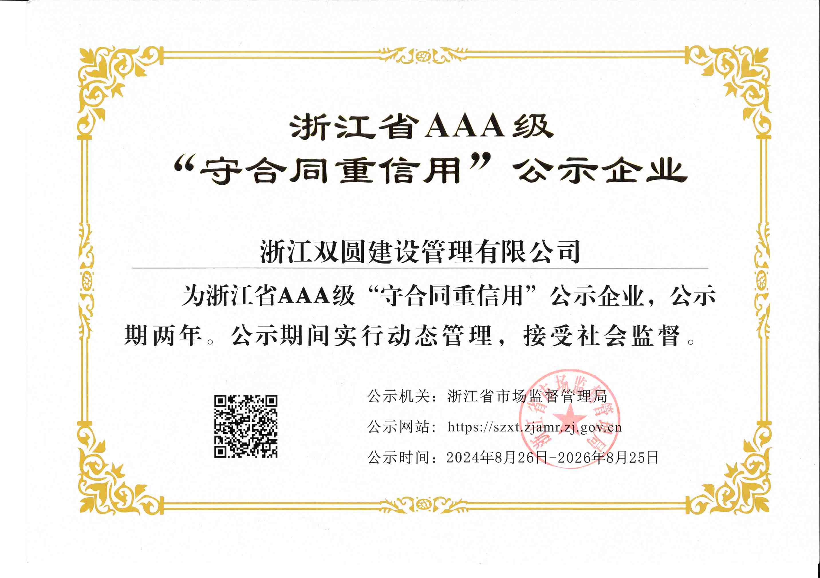 11月14日,公司再獲浙江省AAA級“守合同重信用”企業稱號,公司已連續十年獲得該榮譽。這一榮譽的背后,是雙圓建管數十年如一日對誠信經營的堅守。公司始終將合同履行和信用建設作為企業發展的重要基石,以嚴格的合同管理和良好的信用記錄,贏得了合作伙伴的信任和市場的贊譽。連續的蟬聯,充分證明了公司在誠信經營方面的卓越表現,也為公司的長遠發展奠定了堅實的信用基礎。