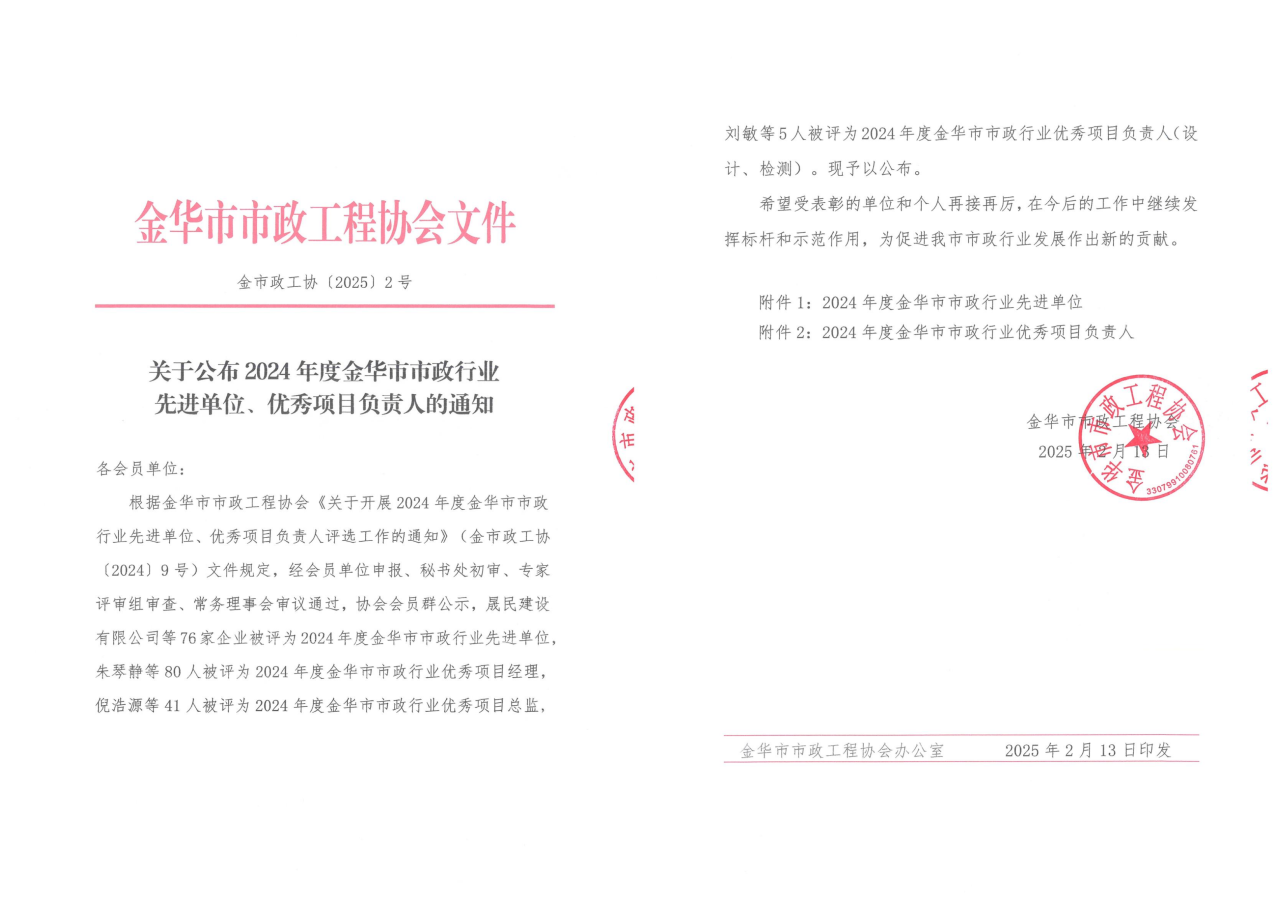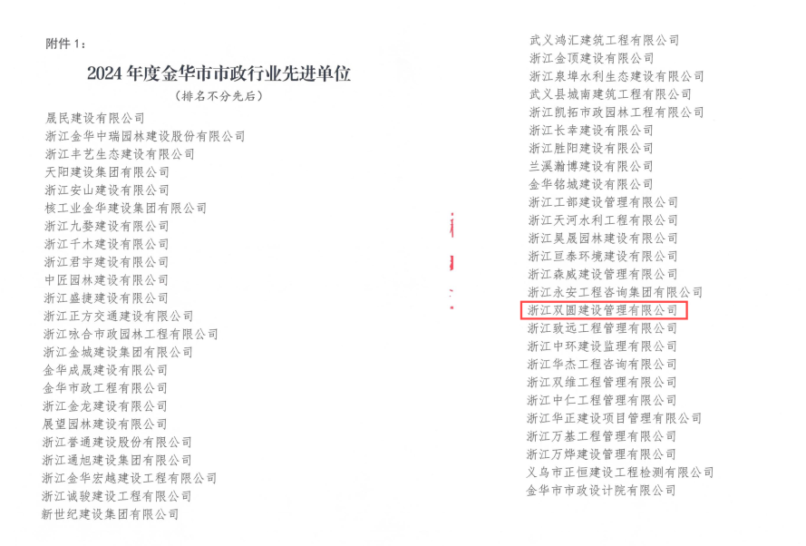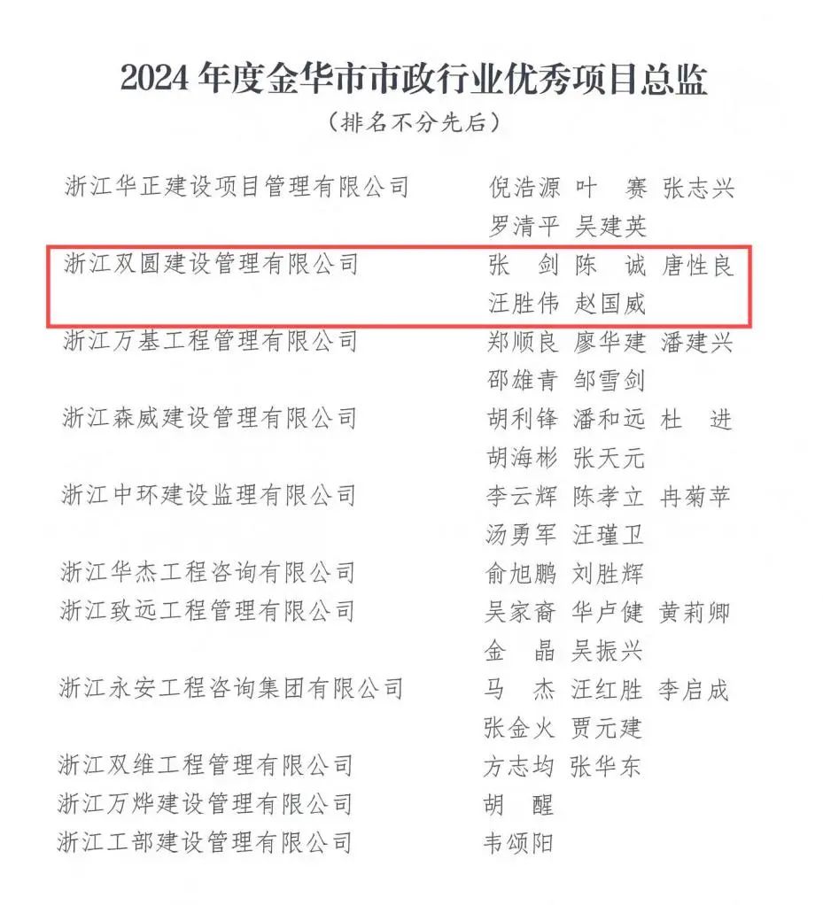 2月13日,金華市市政工程協(xié)會(huì)發(fā)布《關(guān)于公布2024年度金華市市政行業(yè)先進(jìn)單位、優(yōu)秀項(xiàng)目負(fù)責(zé)人的通知》,浙江雙圓建設(shè)管理有限公司榮獲“2024年度金華市市政行業(yè)先進(jìn)單位”稱號(hào)。同時(shí),公司5位項(xiàng)目總監(jiān)獲評(píng)“2024年度金華市市政行業(yè)優(yōu)秀項(xiàng)目總監(jiān)”。這份榮譽(yù),為乙巳蛇年揭開(kāi)了精彩序章。