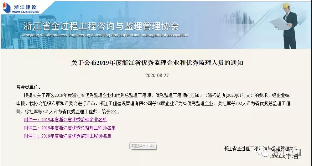 近日,浙江省全過程工程咨詢與監理管理協會公布2019年度浙江省優秀監理企業和優秀監理人員名單,經專家和評委會評審公示,全省48家企業評為省優秀監理企業、302人評為省優秀總監理工程師、321人評為省優秀監理工程師。我公司再次被評為浙江省優秀監理企業。同時公司姜桂軍、陽橋輝、吳建軍、蔣忠東等4人被評為浙江省優秀總監理工程師,值得鼓勵的是公司姜桂軍總監以117分位居浙江省優秀總監理工程師之首;另鄭繼財、劉天順、李俊波等3人被評為浙江省優秀監理工程師。