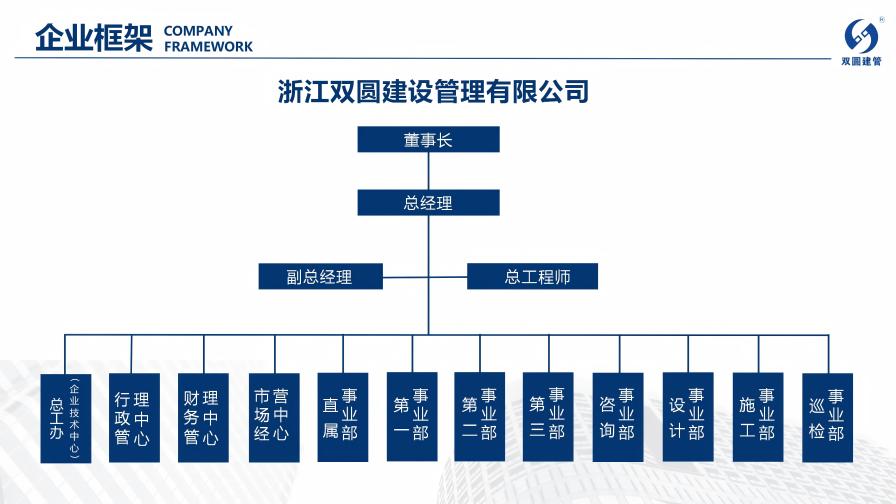 企業的組織架構決定企業的長期發展戰略,決定著企業的組織高效運作與否。雙圓建管本著簡潔、科學、務實的管理方針,對公司發展作出了長遠規劃。公司下設四個中心、八個事業部,形成了以項目為核心,部門為單位,精細化管理為準繩的組織架構,竭力為建筑業發展提供優質的全過程工程咨詢服務。